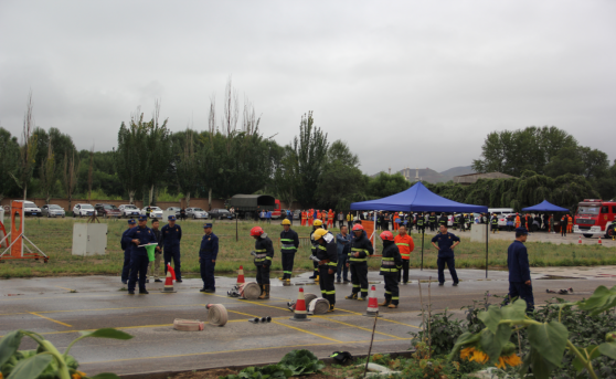 本次比武競賽共有42支隊伍參加,我公司平安消費品市場參加了一人兩盤水袋連接操、原地著滅火防護服百米負重跑個人技能比賽項目和手提式干粉滅火器滅油槽火操、固定消防設(shè)施撲滅初起火災(zāi)操集體比賽項目。
