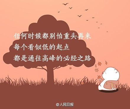任何時候都別怕重來,每個看似低的起點(diǎn),都是通往高峰的必經(jīng)之路。你不努力,誰又能替你成長?來源:新浪微博@人民日報