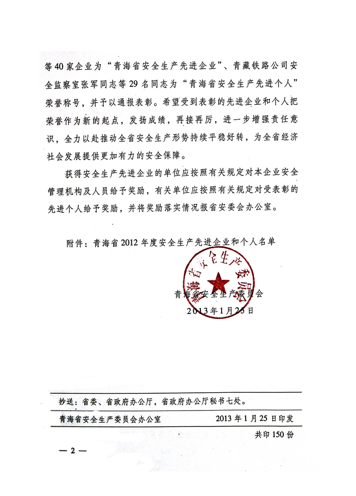 2012年,在省委、省政府的正確領(lǐng)導(dǎo)下,青海省物產(chǎn)集團總公司認(rèn)真學(xué)習(xí)貫徹黨的十八大精神,全面貫徹落實科學(xué)發(fā)展觀,牢固樹立以人為本、安全發(fā)展的理念,深入開展"安全生產(chǎn)年"、"隱患排查治理"、"打非治違"等活動,為促進全省安全生產(chǎn)形勢持續(xù)穩(wěn)定好轉(zhuǎn)做出了積極貢獻。為此,經(jīng)省政府同意,省安全生產(chǎn)委員會決定授予青海省物產(chǎn)集團總公司"2012年度安全生產(chǎn)先進企業(yè)"榮譽稱號。